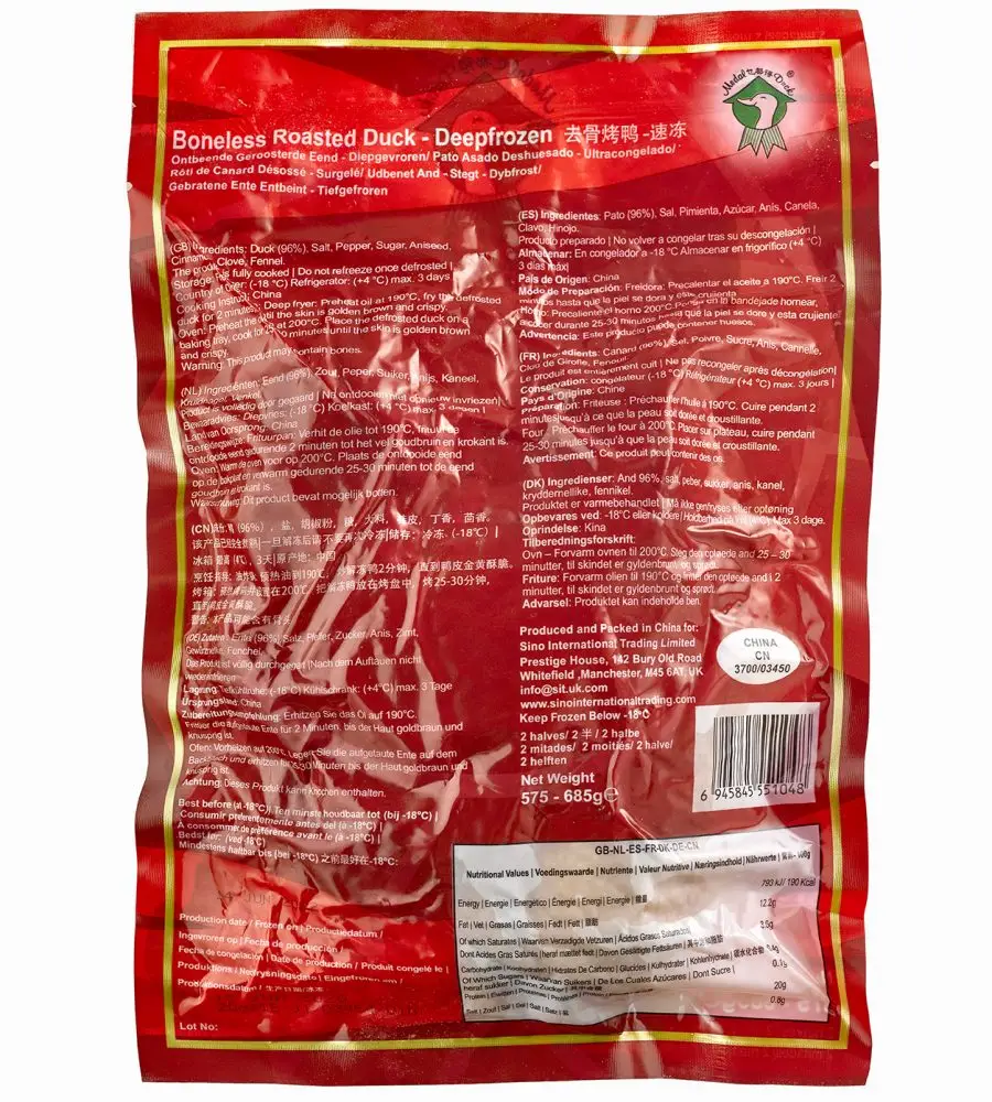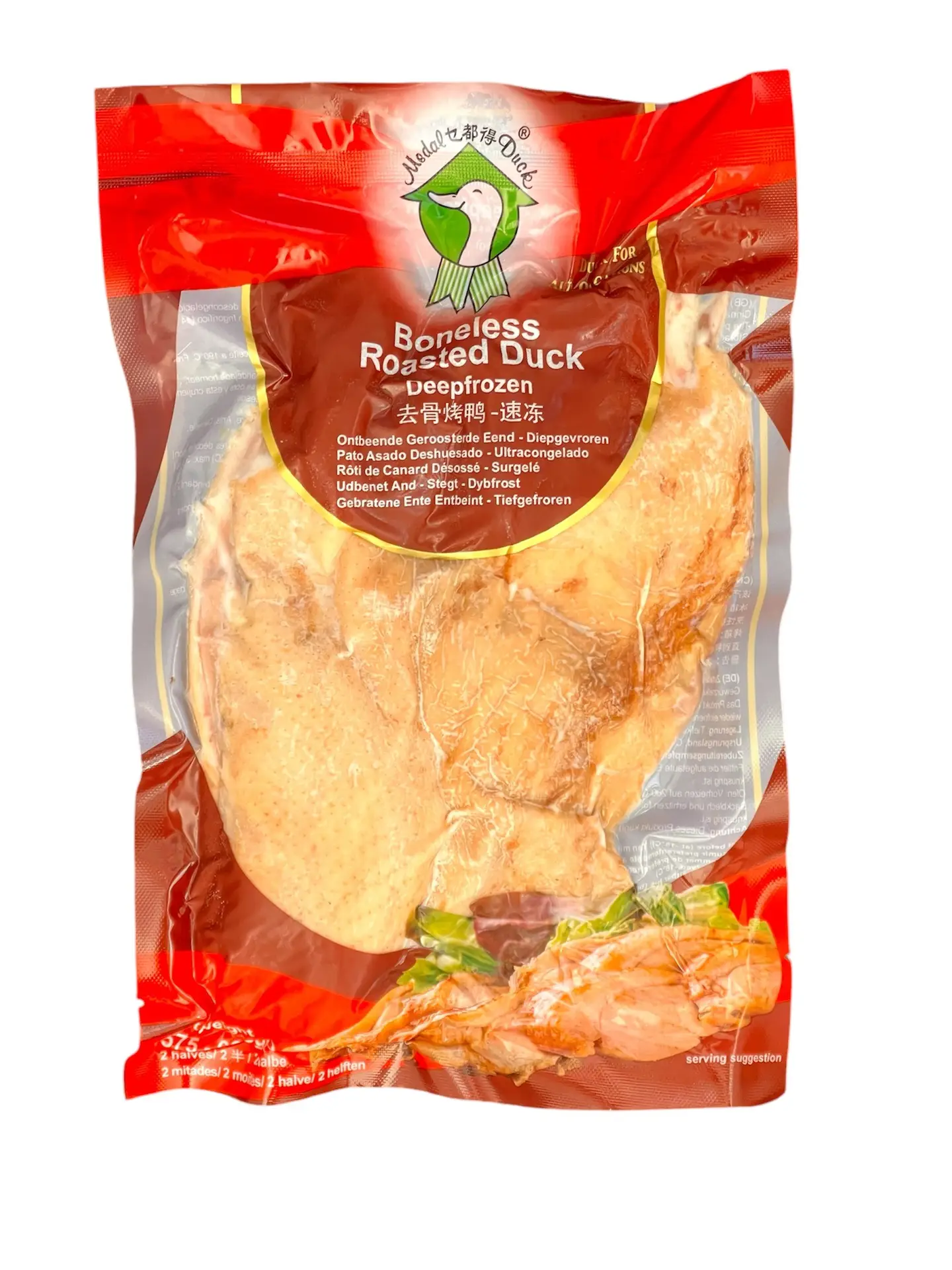 Deze verpakking bevat twee halve eenden, zonder bot, perfect voor het creëren van een gerecht in Peking eend-stijl.
